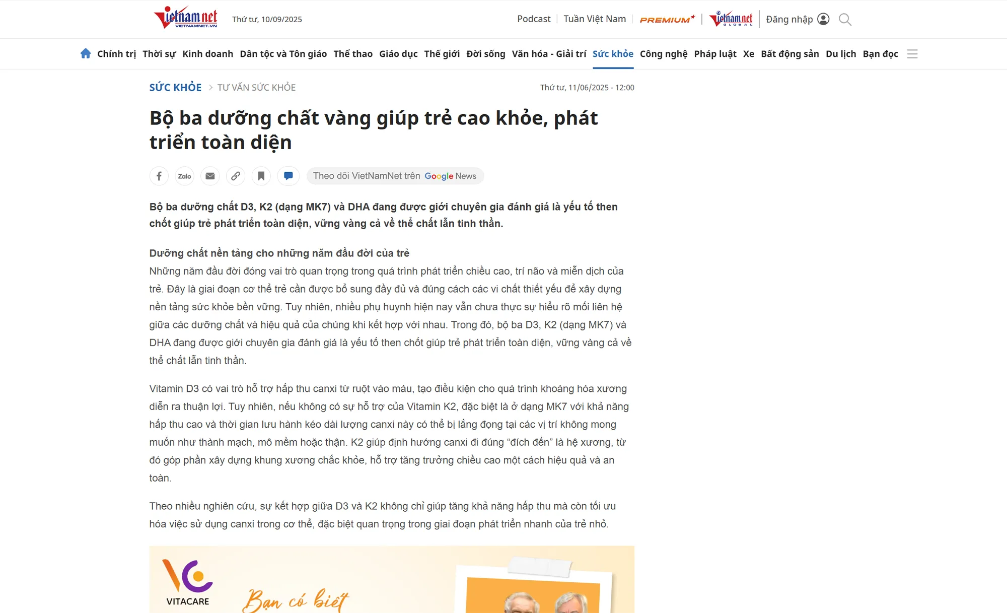 Vietnamnet.vn: VitaCare mang “bộ ba vàng” D3 – K2 – DHA chuẩn Úc đến trẻ em Việt