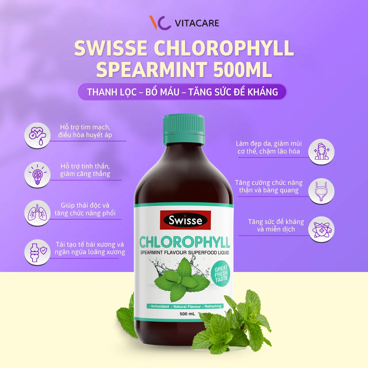 Swisse Chlorophyll Spearmint 500ml – Diệp Lục Vị Bạc Hà là một siêu thực phẩm xanh giàu dinh dưỡng, kết hợp hương vị bạc hà tươi mát tự nhiên, được nghiên cứu và sản xuất bởi Swisse, thương hiệu chăm sóc sức khỏe uy tín hàng đầu tại Úc. Với cấu trúc phân tử đặc biệt, diệp lục trong Swisse Chlorophyll hỗ trợ vận chuyển oxy, thúc đẩy quá trình trao đổi khí trong cơ thể, đồng thời cung cấp các vitamin thiết yếu giúp tăng cường sức khỏe, giúp bạn cảm nhận sự tươi trẻ và khỏe mạnh từ bên trong.