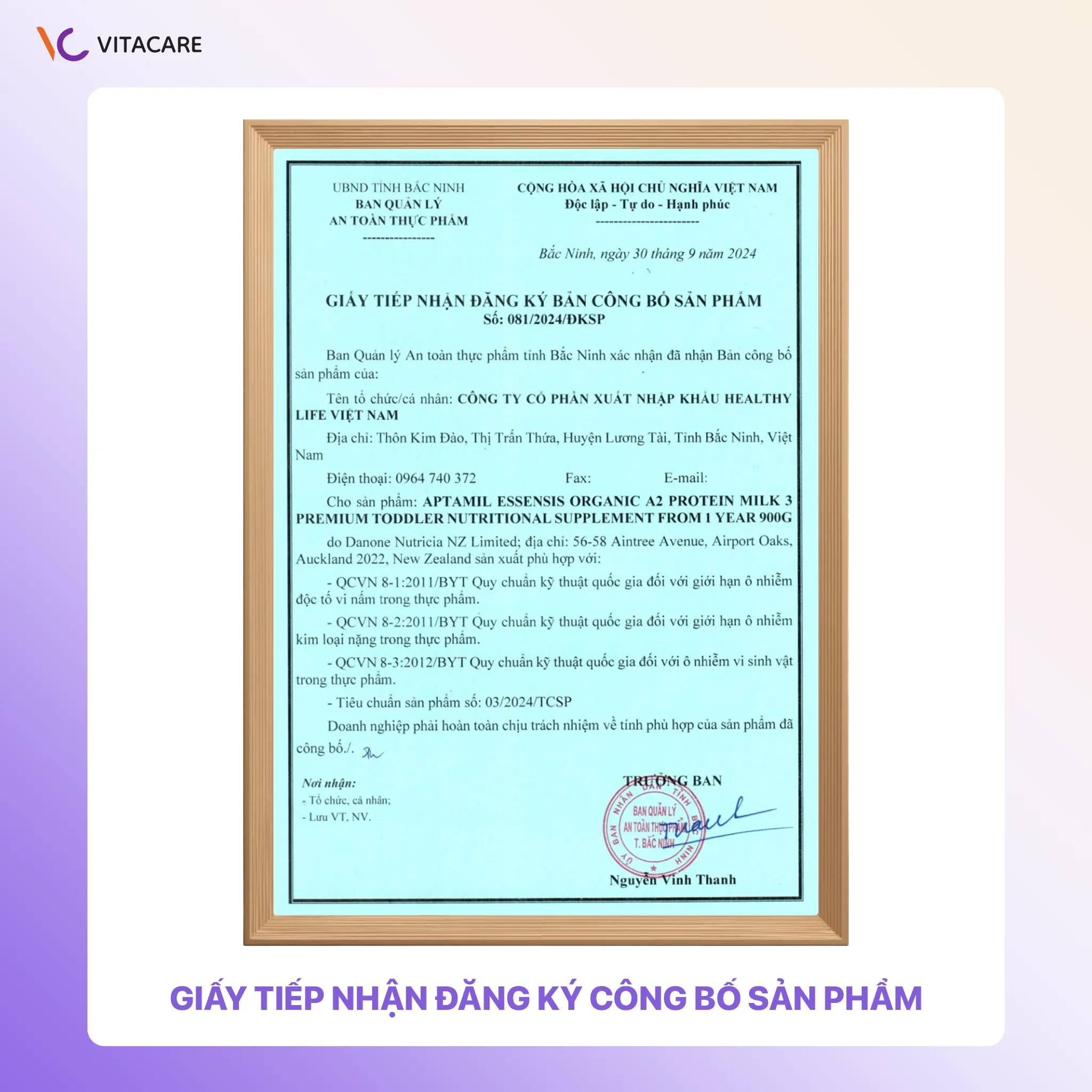 Sữa Aptamil Essensis số 3 đang được VitaCare nhập khẩu và phân phối chính hãng tại Việt Nam, có tem chống hàng giả, tem phụ độc quyền và đầy đủ hồ sơ công bố sản phẩm bởi cơ quan chức năng có thẩm quyền.