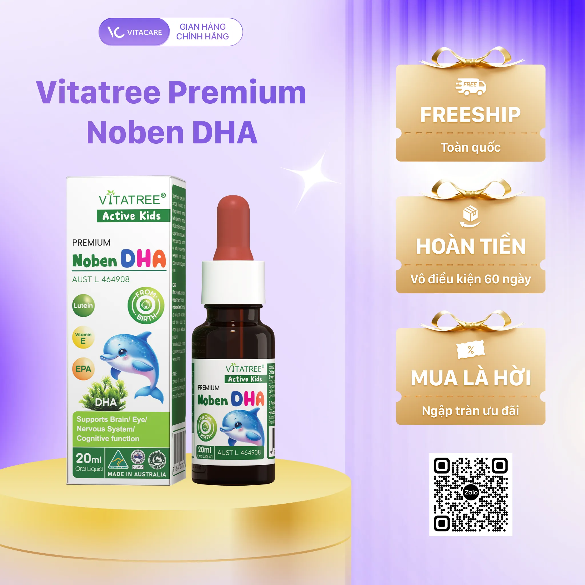 Thành lập từ năm 2013 bởi B.Pure Australia, Vitatree nhanh chóng trở thành thương hiệu chăm sóc sức khỏe hàng đầu tại Úc và toàn cầu. Các sản phẩm của Vitatree, bao gồm cả Vitatree Premium Noben DHA được sản xuất 100% tại Úc từ nguyên liệu thiên nhiên, kết hợp công nghệ hiện đại, đạt chuẩn cGMP và tuân thủ nghiêm ngặt quy định của TGA – Cục Quản lý Hàng hóa Trị liệu Úc.
