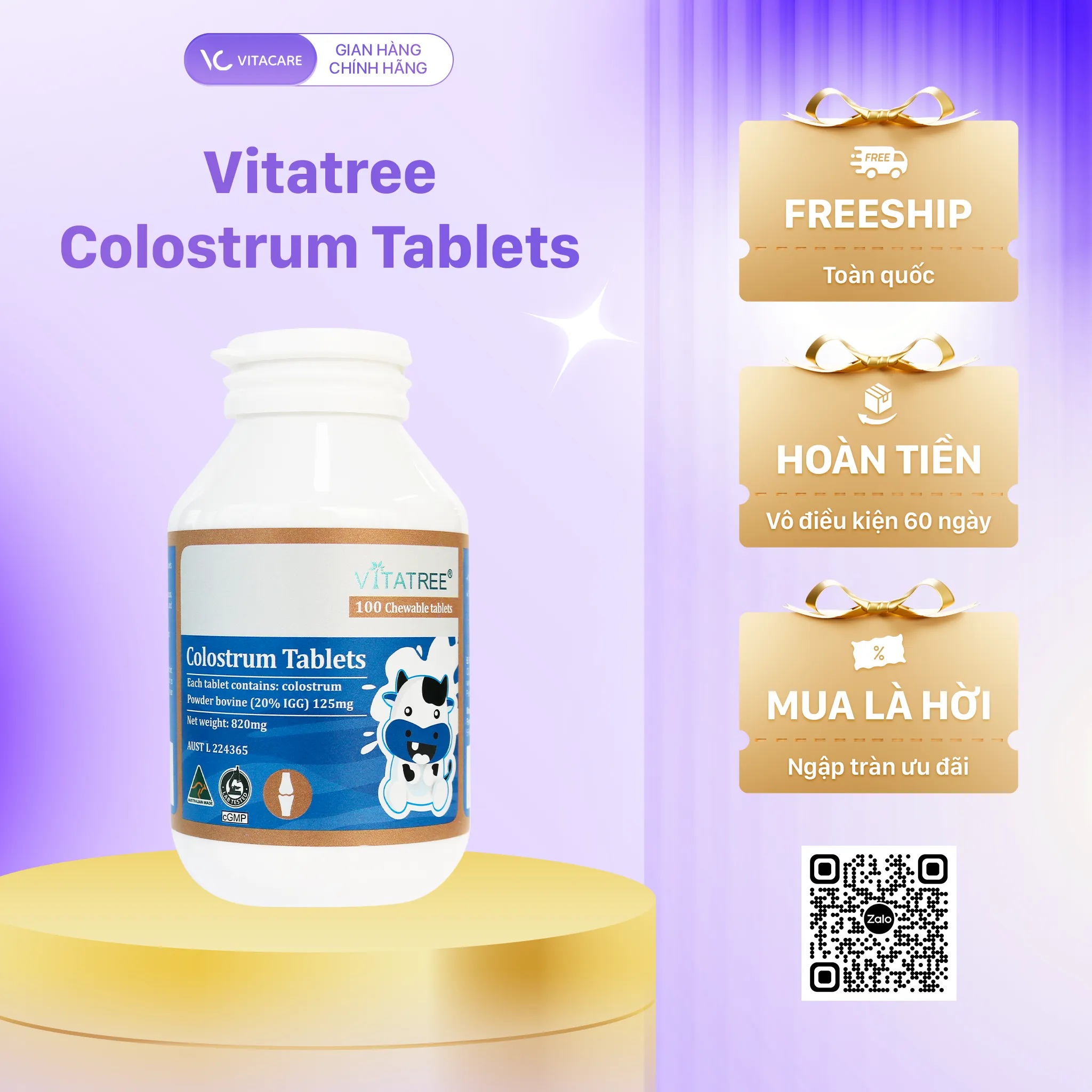Viên sữa bò non Vitatree Colostrum Tablets được bào chế từ sữa non nguyên chất thu hoạch trong vòng 24 giờ đầu sau khi bò mẹ sinh – giai đoạn chứa hàm lượng kháng thể IgG và dưỡng chất sinh học cao nhất. Sữa được lấy từ những con bò khỏe mạnh tại các trang trại đạt chuẩn tại Úc và sử dụng công nghệ chế biến hiện đại để giữ trọn dưỡng chất trong sữa bò non.