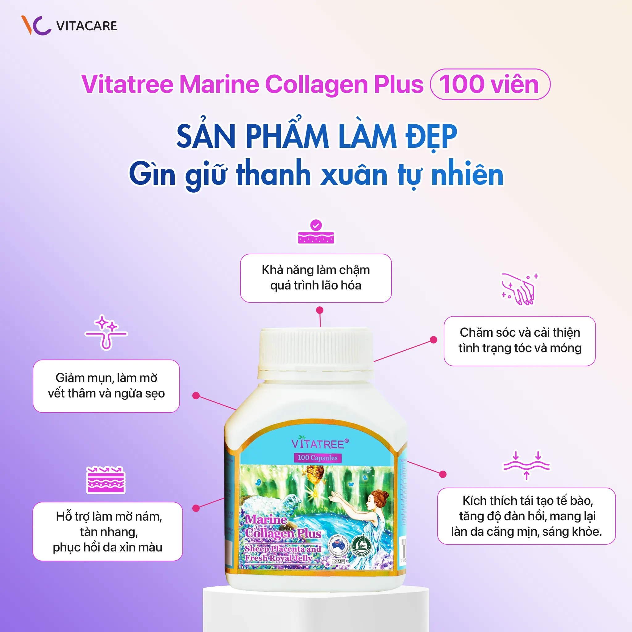 *Vitatree Marine Collagen Plus 100 viên là thực phẩm bổ sung, không phải thuốc, và không có tác dụng thay thế thuốc chữa bệnh.