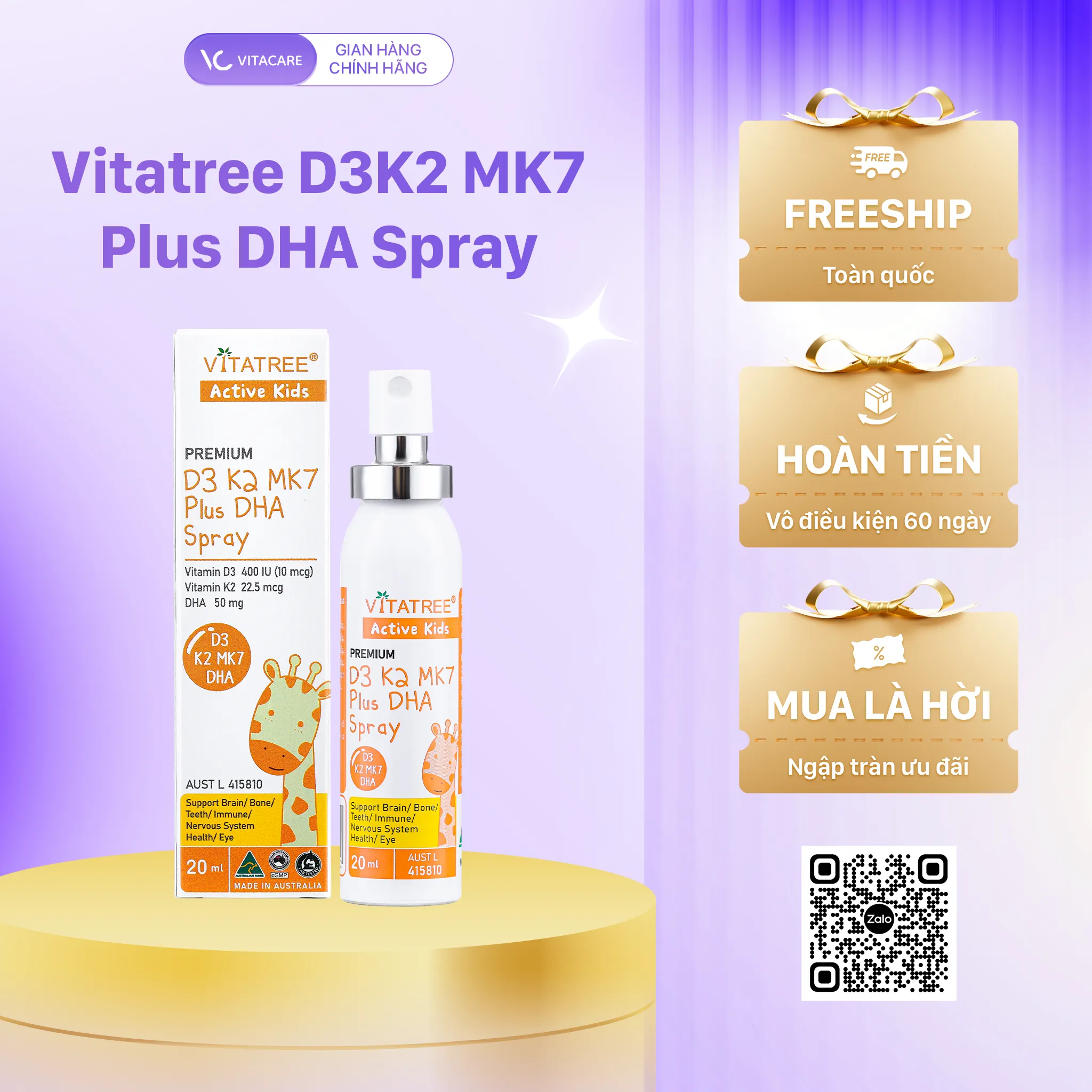 Xịt Vitatree Premium D3K2MK7 Plus DHA là sản phẩm tiên phong kết hợp giữa vitamin D3, K2 MK7 và DHA từ tảo tự nhiên. Sản phẩm hỗ trợ trẻ phát triển xương và cải thiện trí não, thị lực. Đặc biệt với công nghệ xịt tiên tiến giúp cơ thể bé hấp thụ dưỡng chất nhanh chóng và dễ dàng.